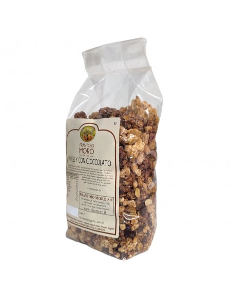 Muesly are mix of cereals and dried fruits. If they are inserted in our daily supply increase the contribution of fibers helping the regularity of intestine and they maintain livel of cholesterol low. This muesly are more tasty thanks to the added of chocolate. Ideal for breakfast alone or accompanied with milk or yogurt.