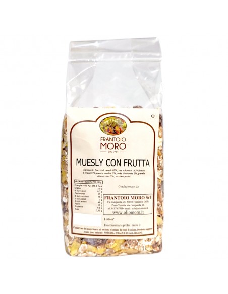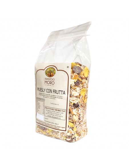 Muesly are mix of cereals and dried fruits. If they are inserted in our daily supply increase the contribution of fibers helping the regularity of intestine and they maintain livel of cholesterol low. This muesly are more tasty thanks to the added of dried fruit. Ideal for breakfast alone or accompanied with milk or yogurt.