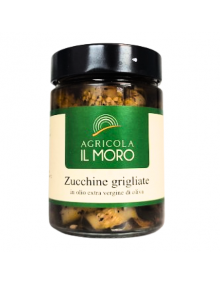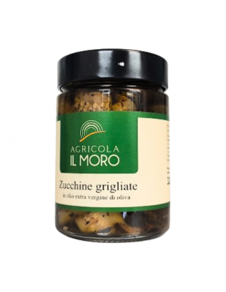 Frantoio MoroThe Grilled zucchini Frantoio Moro, are a tasty preserve all natural. The crunchiness of the zucchini joins our evo oil and natural aromas to give life to this delight. Good and genuine as homemade. Italian product. No dyes added.